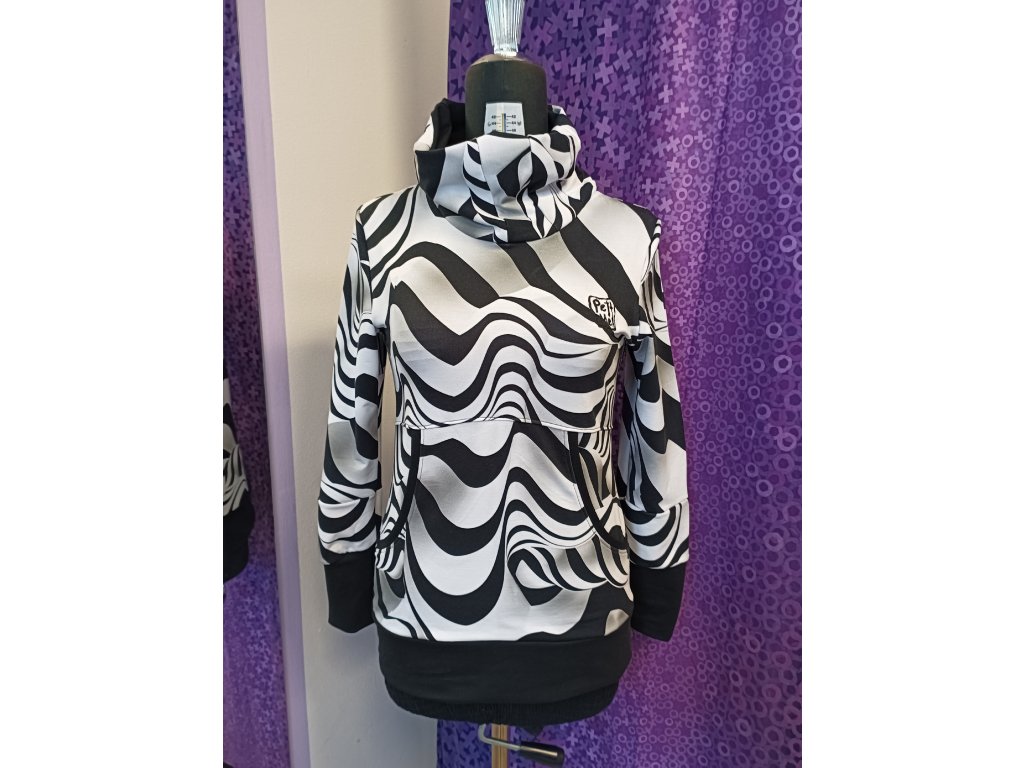 Styl a pohodlí v jednom kousku! Tato mikina z příjemné bavlněné teplákoviny (95 % bavlna, 5 % elastan) tě zahřeje a zároveň dodá tvému outfitu šmrnc. Černobílý základ s výrazným vlnitým motivem působí elegantně i hravě.