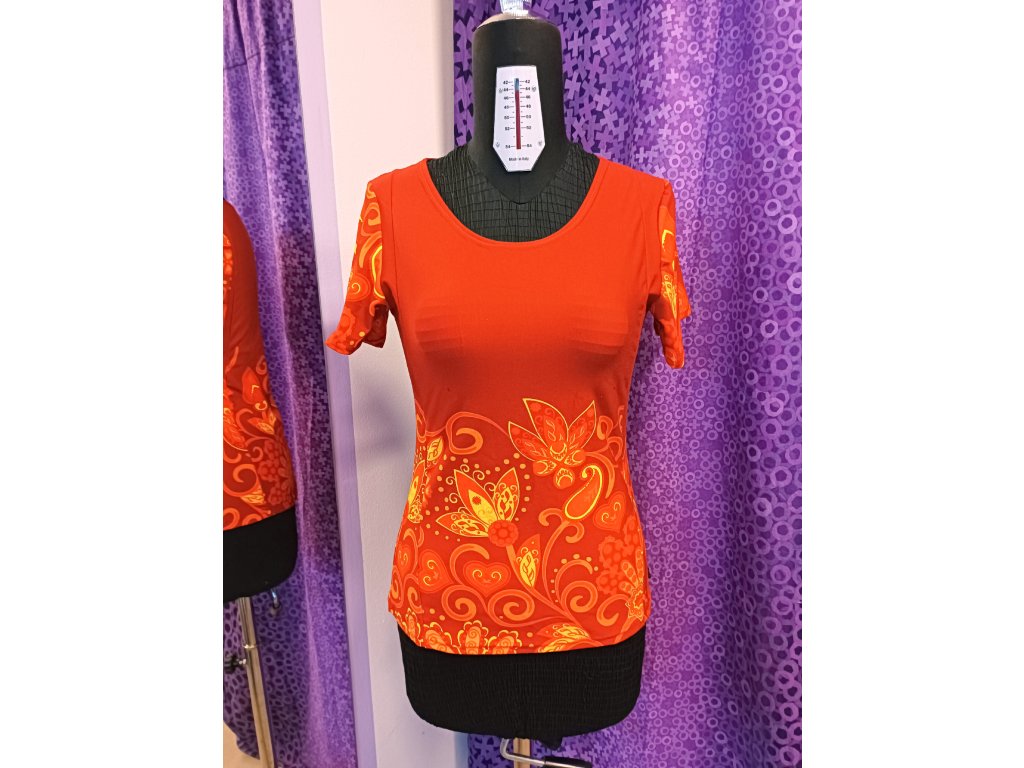 Členěné tričko s krátkými rukávy s krásnou výraznou bordurou ve folklorním stylu. Je z příjemného bavlněného úpletu a hodí se jak k sukním, tak i k šatům.