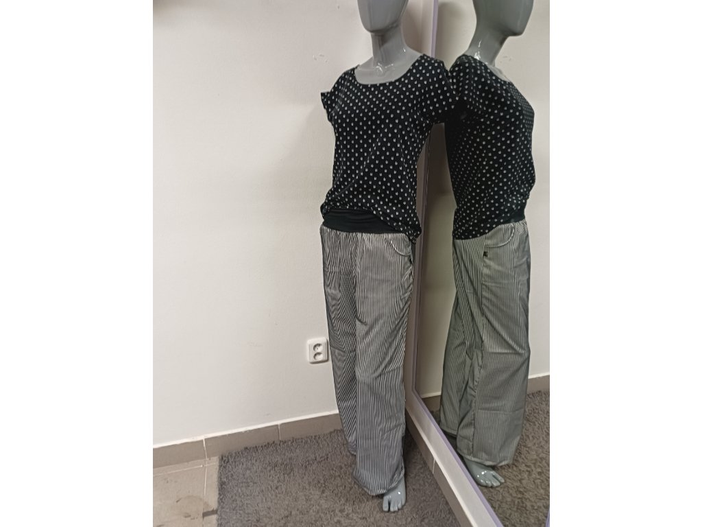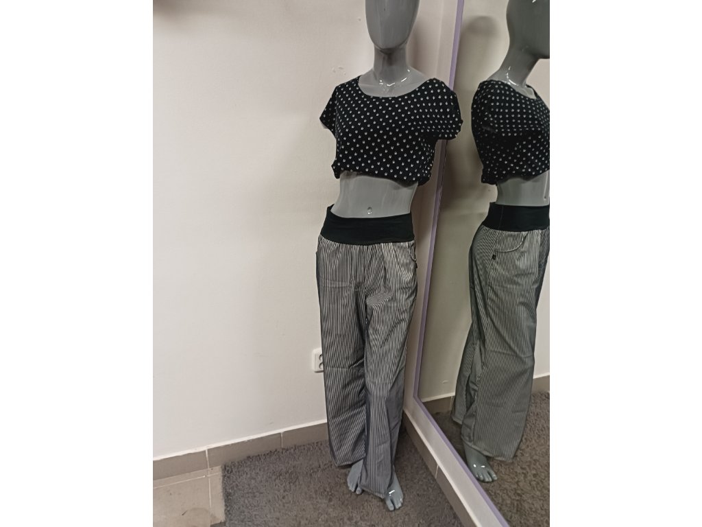 Nesmrtelná černobílá kombinace, vertikální jemné proužky opticky zeštíhlují a široké nohavice prodlužují nohy