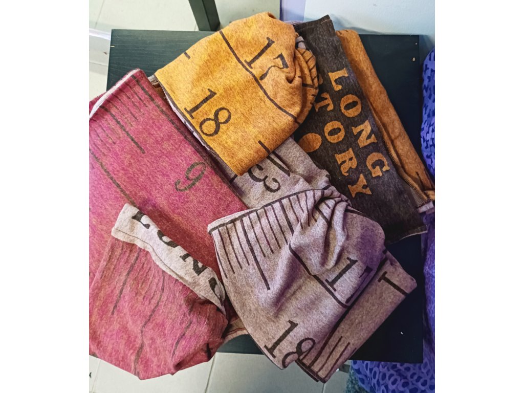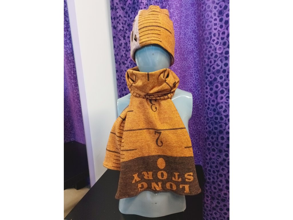 Originální doplněk s netradičním potiskem krejčovského metru. V sadě je dlouhá šála a čepice, která má navíc možnost prostrčeni culíku ven. Jinak je čepice krásně ozdobné uzavřena a otvor na culík není vidět.