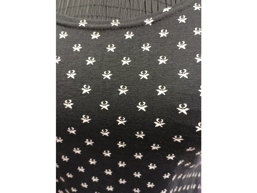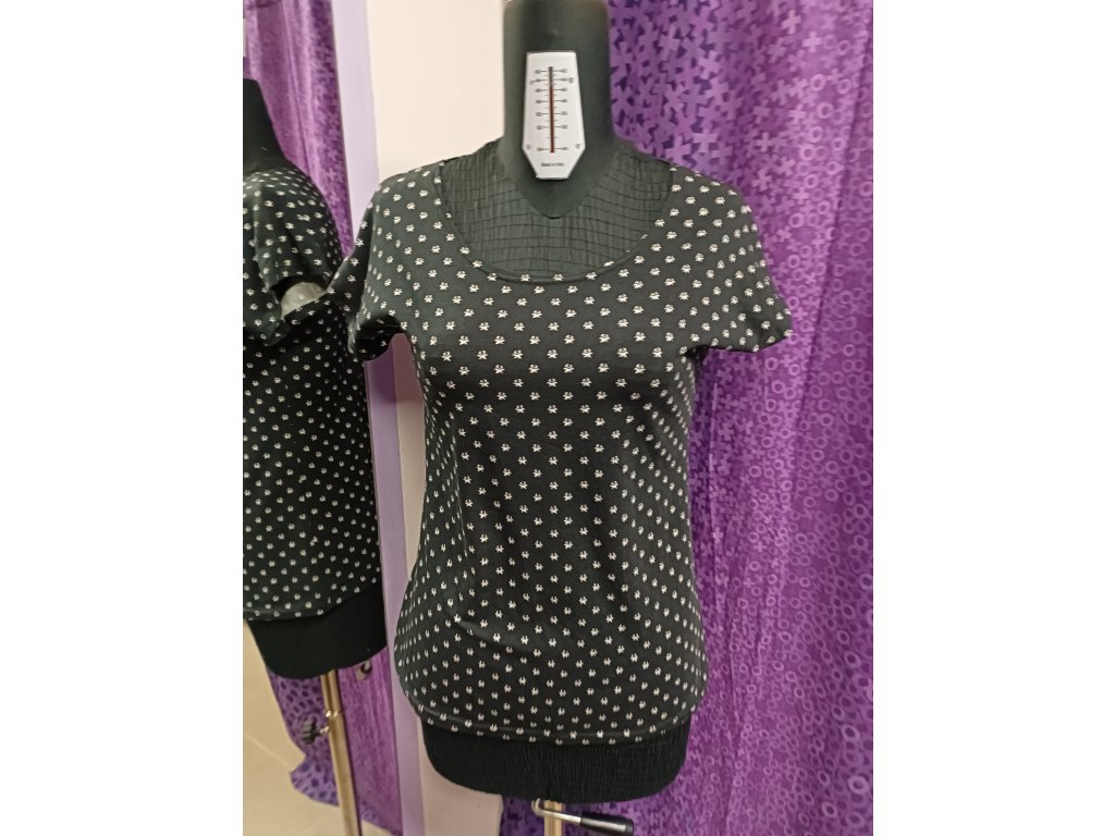 Drobný vzor v černobílé nesmrtelné kombinaci. Jednoduchý lehce projmuté střih s přinechanými rukávy a délka hodící se jak je kalhotám, tak i k sukním