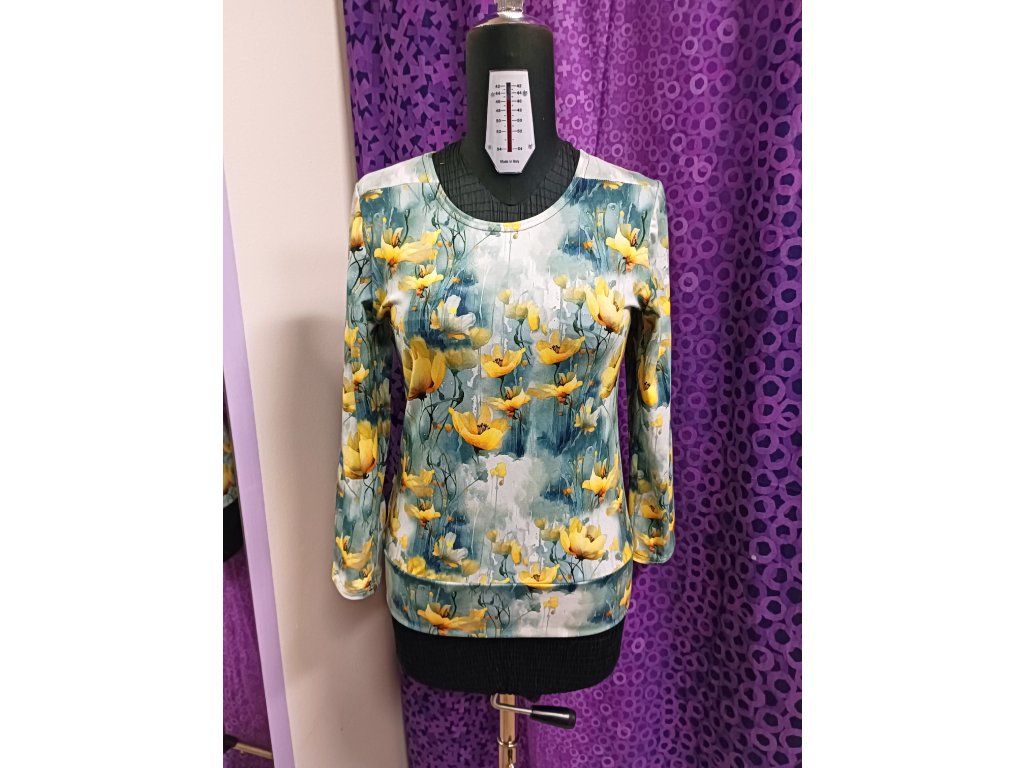 Pohodlné dámské tričko s hodinkovými rukávy s krásným tulipánový k vzorem v šedožlutá barvách. Spodní okraj je zakončen dvojitým lemem a krásně se hodí k sukním i ke kalhotám.
